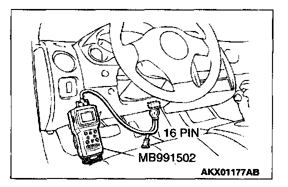 CAUTION: To prevent damage to scan tool MB991502, always turn the ignition switch to the "LOCK" (OFF) position before connecting or disconnecting scan tool MB991502.