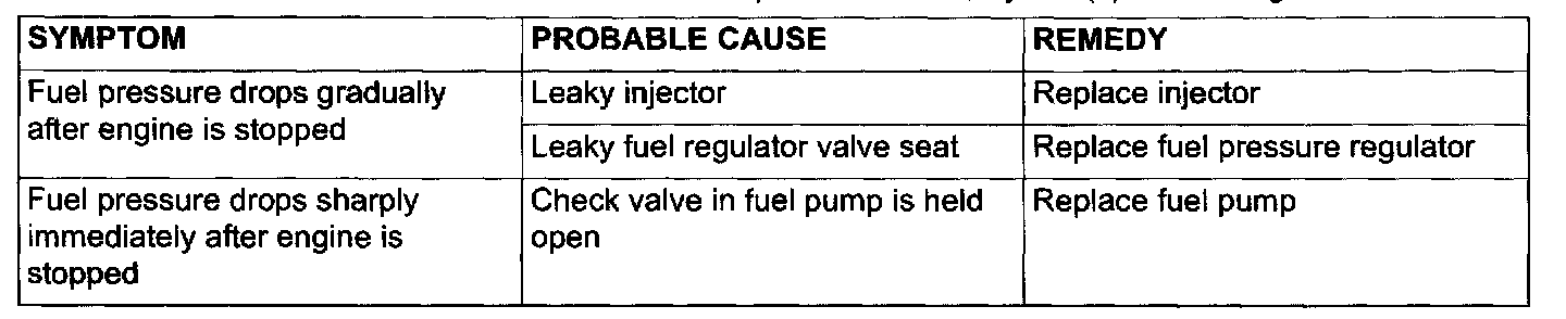 13. Stop the engine and observe fuel pressure gauge reading. It is normal if the reading does not drop within two minutes. If it does, observe the rate of drop and troubleshoot and repair according to the table. Start, then stop the engine.