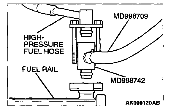 15. Remove the fuel pressure gauge, and special tools MD998709 and MD998742 from the fuel rail.