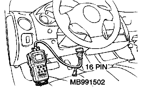 CAUTION: To prevent damage to scan tool MB991502, always turn the ignition switch to the "LOCK" (OFF) position before connecting or disconnecting scan tool MB991502.