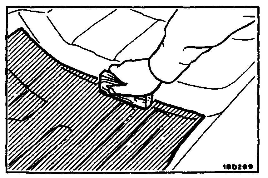 ATTACHMENT OF SILENCERSSilencers (petroleum-asphalt sheets) are attached to the upper surface of the floor and at the interior side of the dash panel in order to absorb vibrations and shut out exhaust gas heat. If these silencers are peeled off in the course of replacement or repair of a welded panel, cut and attach replacement materia (in the shape shown in the figure). For detailed information concerning the locations where silencers are to be attached for individual models, refer to the manual for that model.