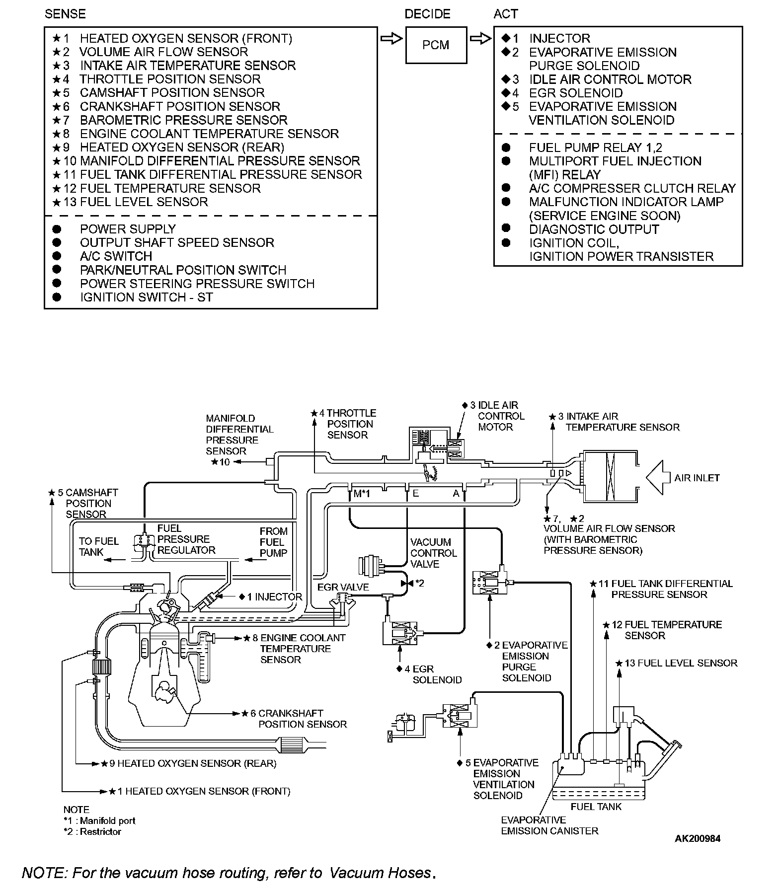 The Multiport Fuel Injection System consists of sensors, actuators and the powertrain control module (PCM). The sensors detect the engine condition. The module controls the system based on signals from these sensors. The actuators work under the control of the PCM. The PCM carries out activities such as fuel injection control, idle air control, and ignition timing control. In addition, the PCM is equipped with several diagnostic test modes which simplify troubleshooting when a problem develops.
