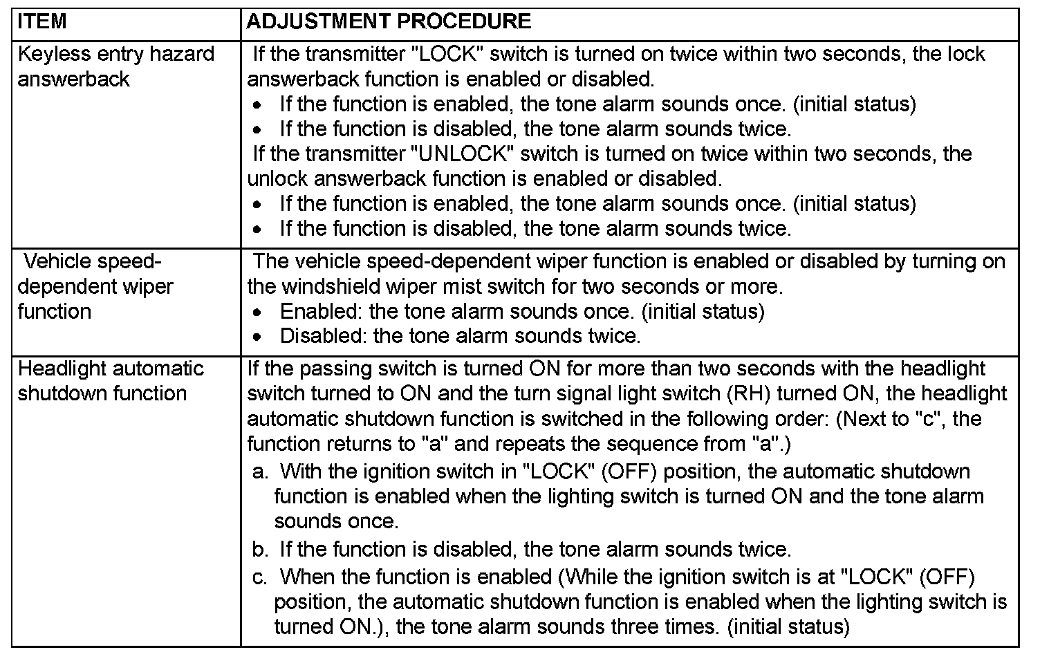 NOTE: The keyless entry hazard answerback can be also adjusted by operating the RKE transmitter, (however, this adjustment can be done more easily by operating the transmitter.) Refer to Keyless Entry System - On-vehicle Service - Enabling/disabling the Answerback Function.