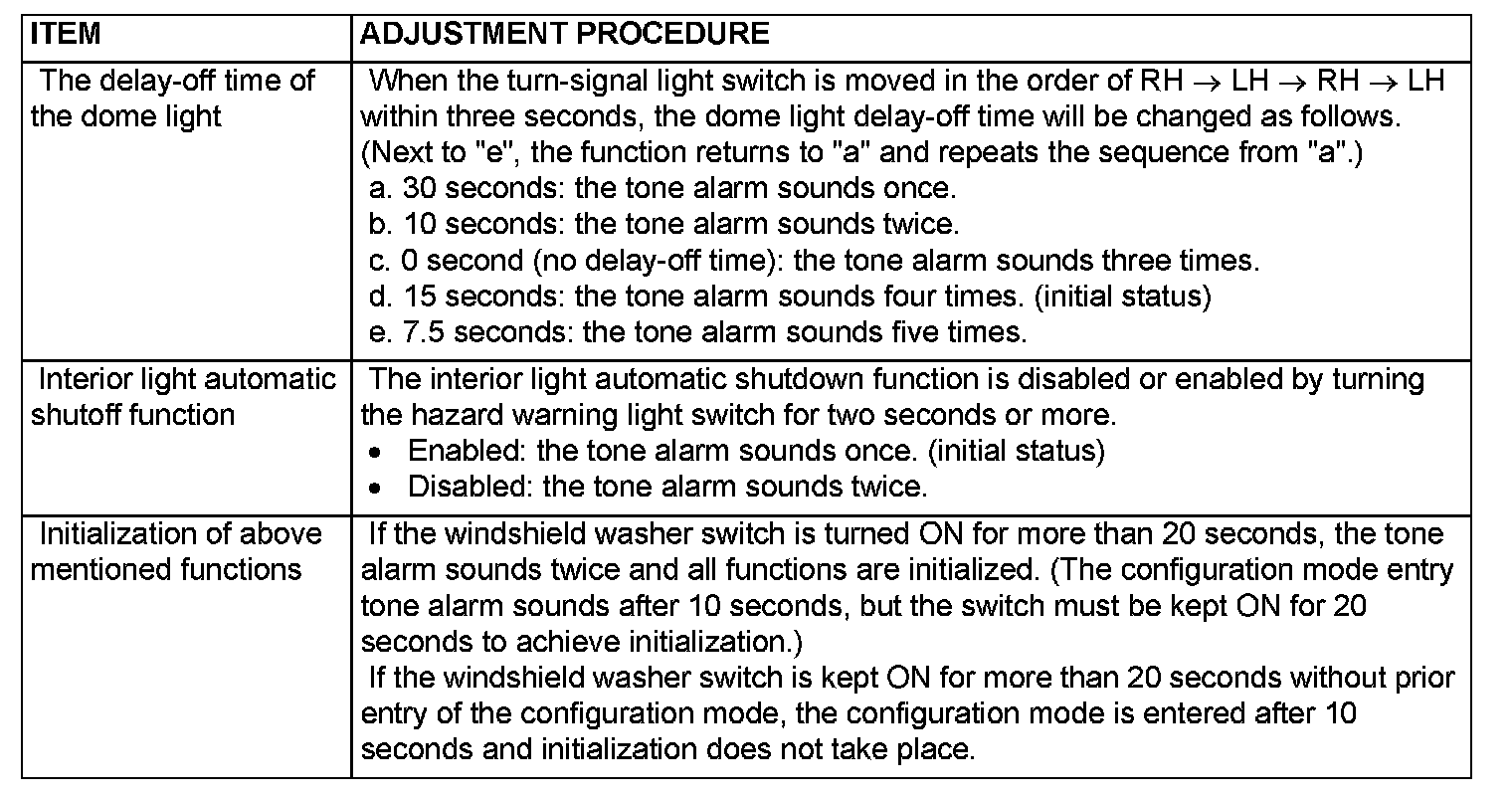 2. If the windshield washer switch remains on for 10 seconds or more, the tone alarm incorporated in the ETACS-ECU sounds once, and then enter the adjustment mode.