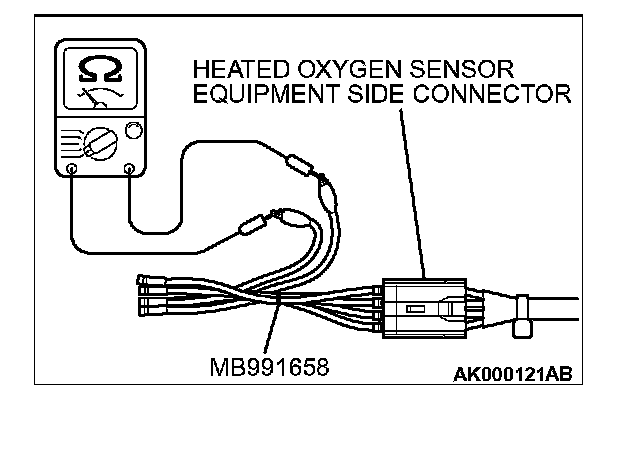 1. Disconnect the heated oxygen sensor connector and connect special tool MB991658 to the connector on the heated oxygen sensor side.