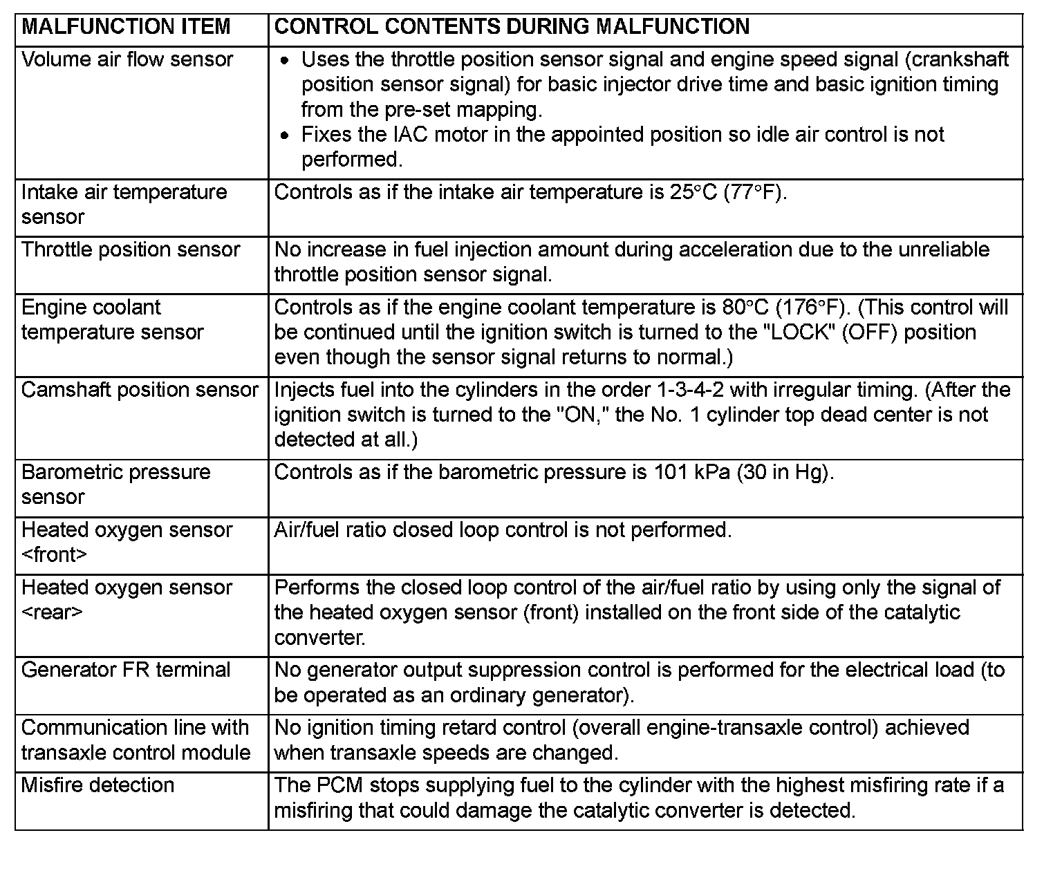 When the main sensor malfunctions are detected by the diagnostic test mode, the vehicle is controlled by means of the given defaults.
