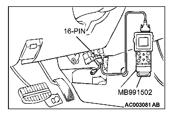 CAUTION: To prevent damage to scan tool MB991502, always turn the ignition switch to the "LOCK" (OFF) position before connecting or disconnecting scan tool MB991502.