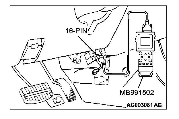 CAUTION: To prevent damage to scan tool MB991502, always turn the ignition switch to the "LOCK" (OFF) position before connecting or disconnecting scan tool MB991502.