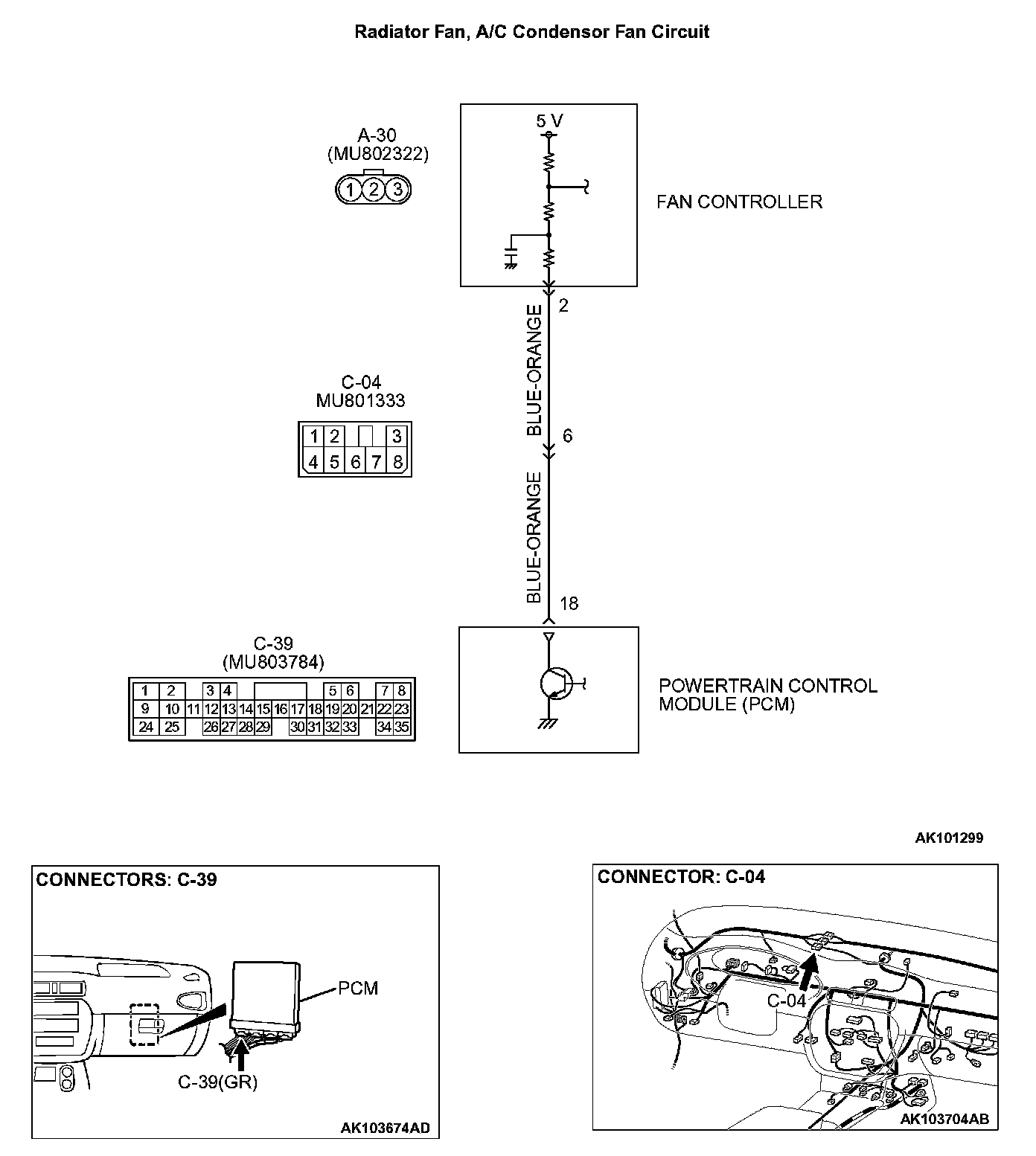 STEP 3. Check for open circuit and short circuit to ground and harness damage between fan controller A-30 (terminal No. 2) and PCM connector C-39 (terminal No. 18).