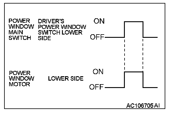 When the driver's power window switch on the power window main switch is pushed down fully, the system energizes its respective power window motor, and then driver's window glass moves to its lowest position.