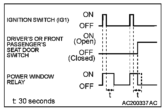 When the ignition switch is turned to the "ON" position, the power window relay is turned ON. After the ignition switch is turned OFF, the system continues to turn ON the power window relay for about 30 seconds and to enable the opening and closing of the door window by the power window switch. When the driver's or front passenger's door is opened while the timer is in operation, the power window relay will be turned OFF.