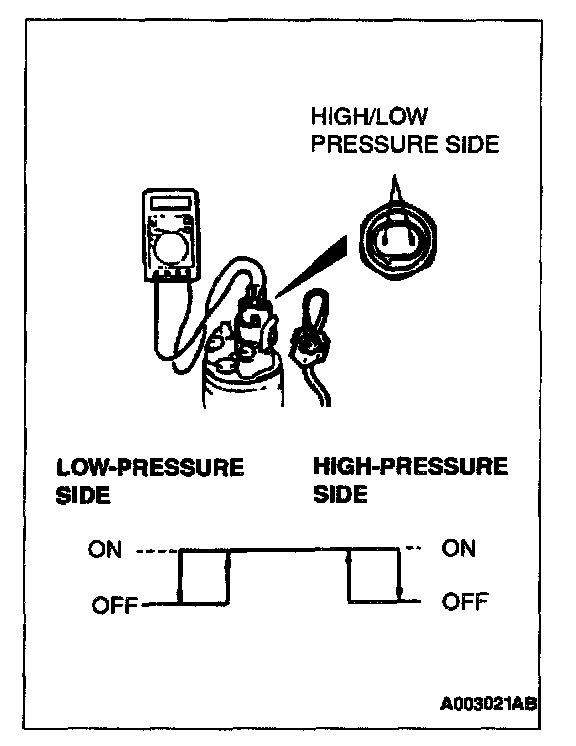 3. When the high/low pressure sides of the dual pressure switch are at operation pressure (ON) and there is continuity between the respective terminals, then the condition is normal. If there is no continuity, replace the switch.