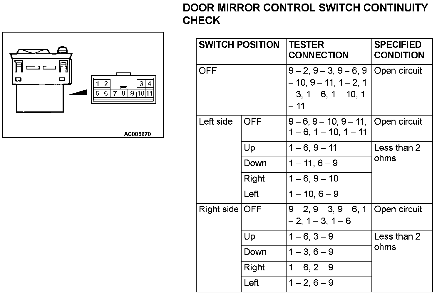 DOOR MIRROR CONTROL SWITCH CONTINUITY CHECK