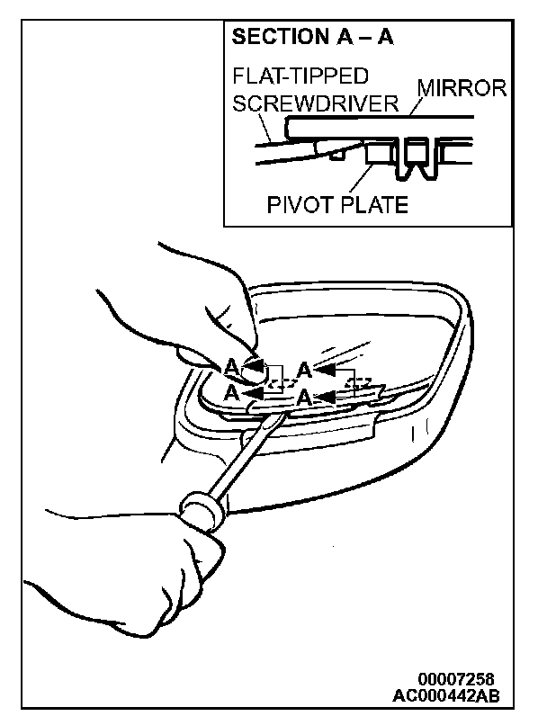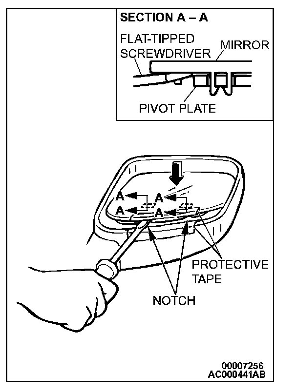 Push the top of the mirror with your hand to tilt it and attach the protective tape as shown in the illustration. Then insert a flat-tipped screwdriver in between the notch at the rear of the mirror and the pivot plate and disengage the bottom of the mirror.