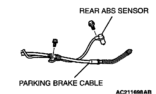 Install the rear ABS sensor, crossing with the parking brake cable as shown.