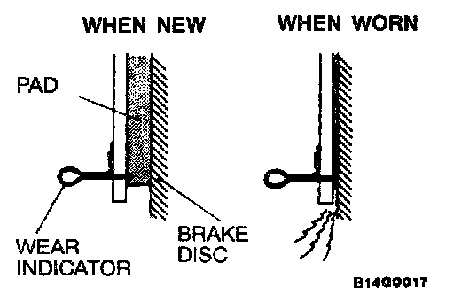 NOTE: The brake pads have indicators that contact the brake disc when the brake pad thickness becomes 2 mm (0.08 inch), and emit a squealing sound to warn the driver.