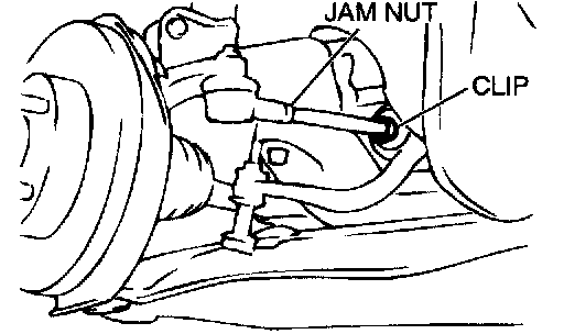 1. Adjust the toe-in by undoing the clip and jam nut, and turning the left and right tie rod turnbuckles by the same amount (in opposite directions).
