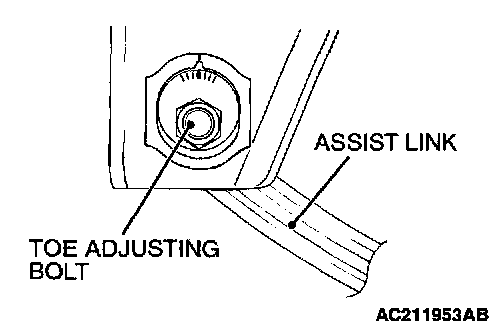 2. Carry out adjustment by turning the toe adjusting bolt (assist link mounting bolt which is located on the inner side of the body).