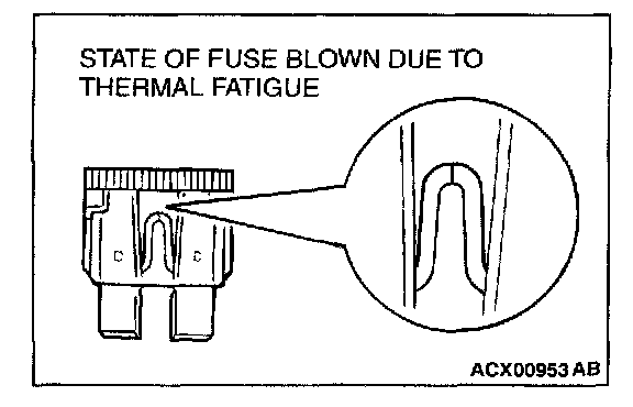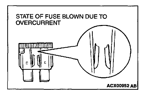 The illustration shows the state of a fuse blown due to this cause. In this case, do not replace the fuse with a new one hastily since a current heavy enough to blow the fuse has flowed through it. First, check the circuit for shorts and check for abnormal electric parts. After correcting shorts or replacing parts, use only a fuse of the same capacity as a replacement. Never use a fuse of larger capacity than the original fuse. If a larger capacity fuse is used, electric parts or wiring could be damaged, or could start a fire.