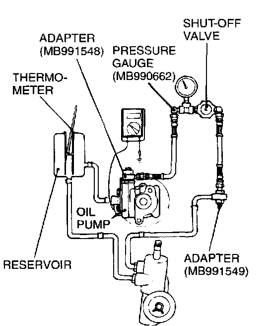1. Disconnect the pressure hose from the oil pump, and then connect the special tools MB991548, MB990662 and MB991549.