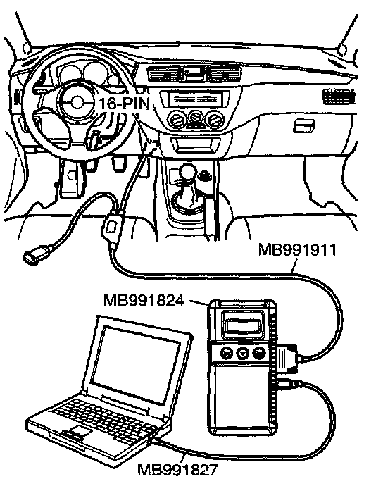 CAUTION: To prevent damage to scan tool MB991502 or MB991958, always turn the ignition switch to the "LOCK" (OFF) position before connecting or disconnecting scan tool MB991502 or MB991958.