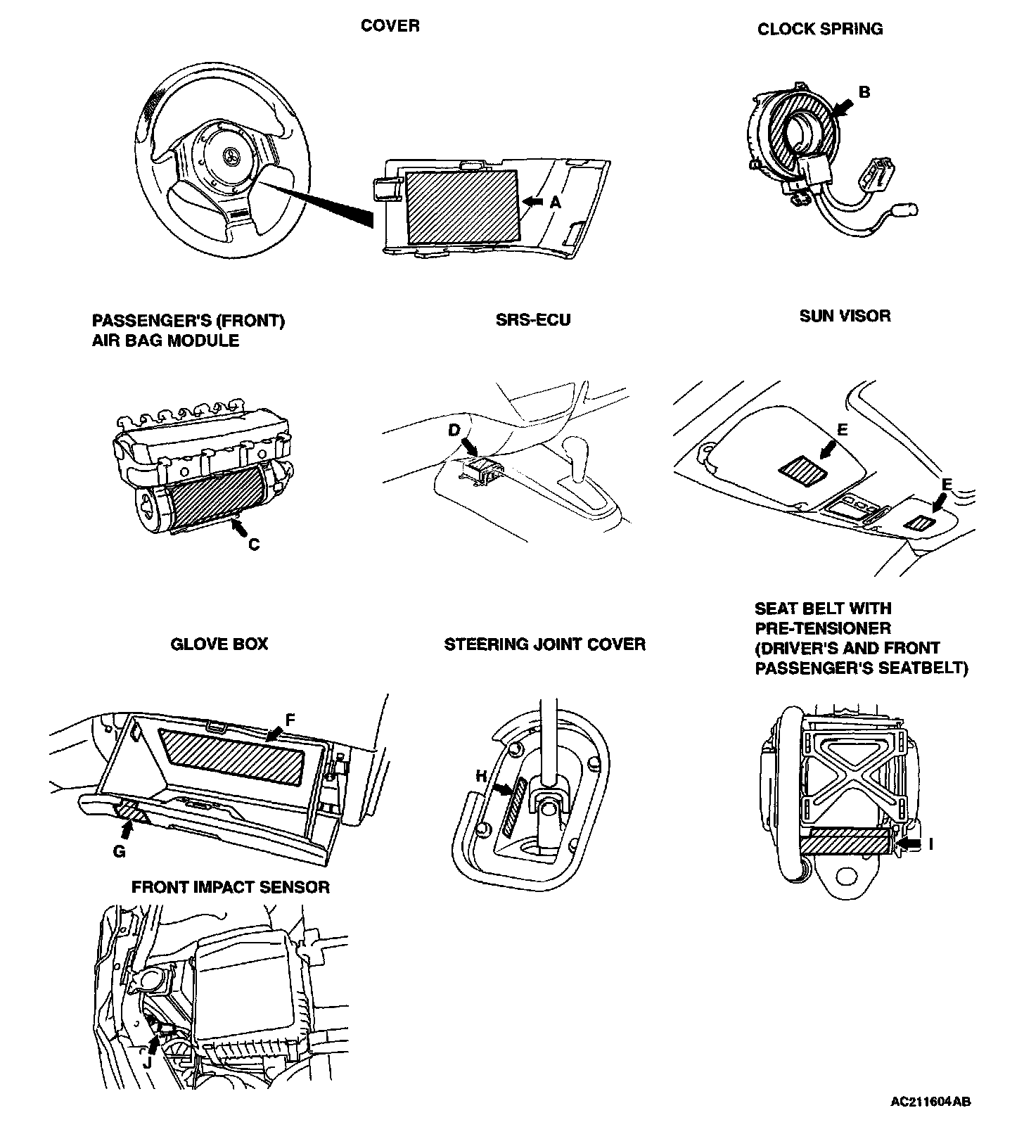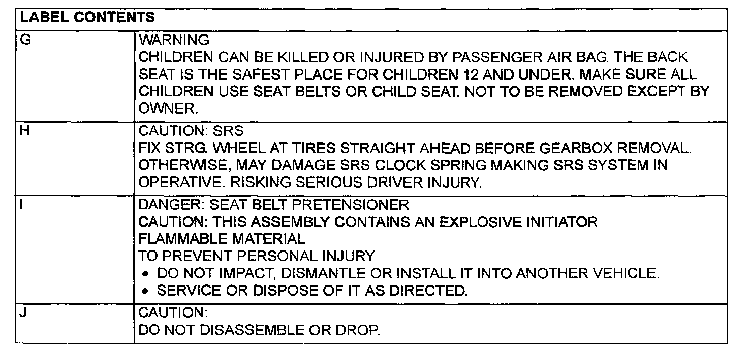 A number of caution labels related to the SRS are found in the vehicle, as shown in the illustration. Follow label instructions when servicing SRS. The label H is not to be removed except by owner. If the other labels are dirty or damaged, replace them.