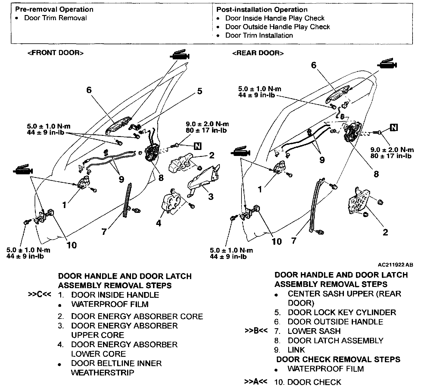 Door latch assembly screw 9.0 ± 2.0 N.m (80 ± 17 in-lb)