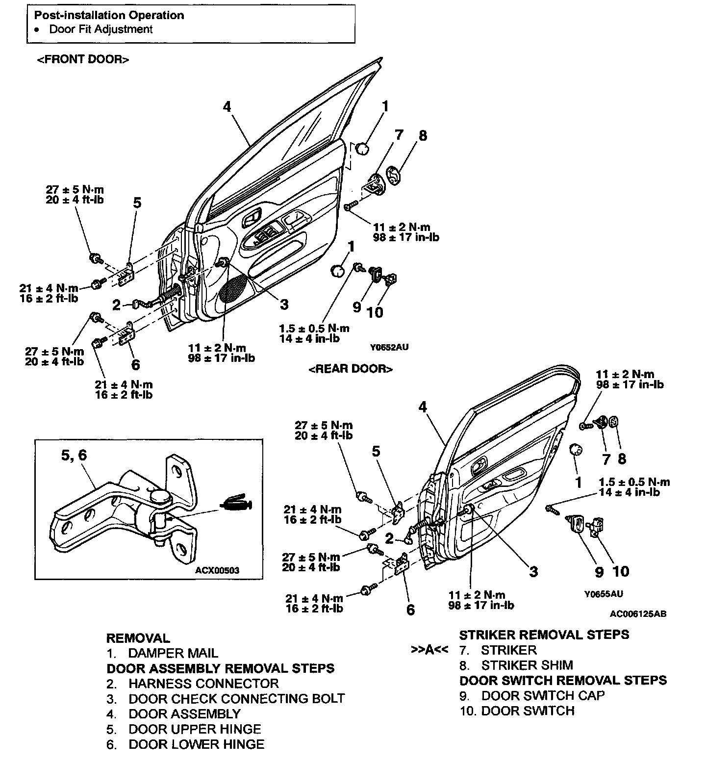 Door hinge bolt (body side) 27 ± 5 N.m (20 ± 4 in-lb)