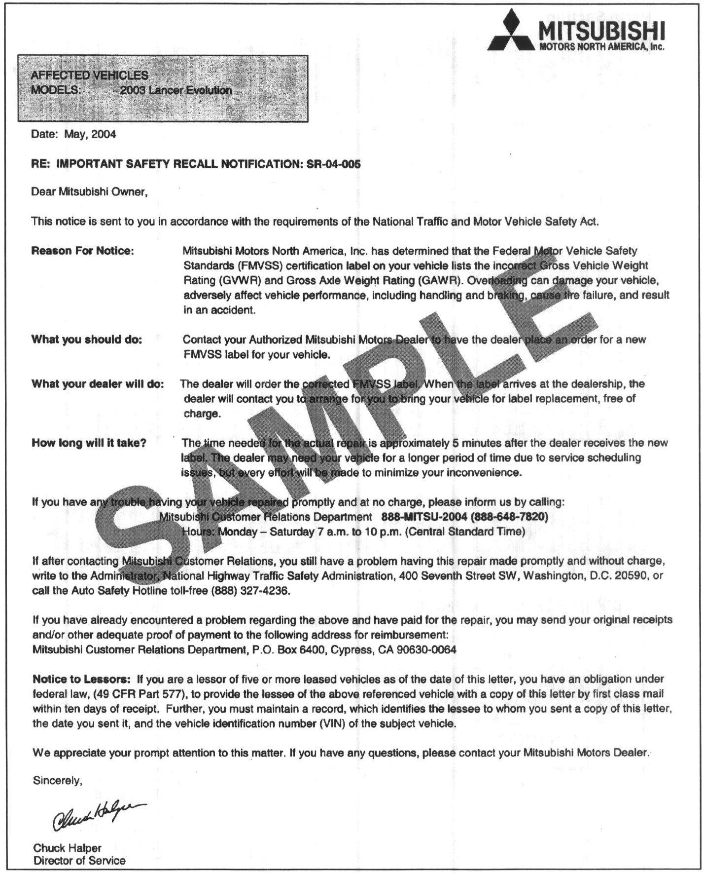 A letter will be sent to all owners of affected vehicles, instructing them to contact their Mitsubishi dealer to have the dealer order a new FMVSS label. A sample copy of a customer notification letter appears later in this bulletin.
