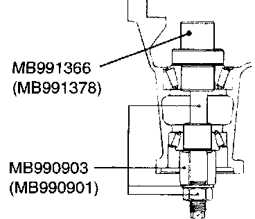 2. Install special tools MB990903 (MB990901) and MB991366 (MB991378), drive pinion front and rear bearing inner races to the differential carrier as shown in the illustration.