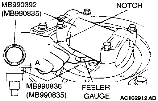 6. Use a feeler gauge to measure the clearance (A) between special tools MB990392 and MB990836.