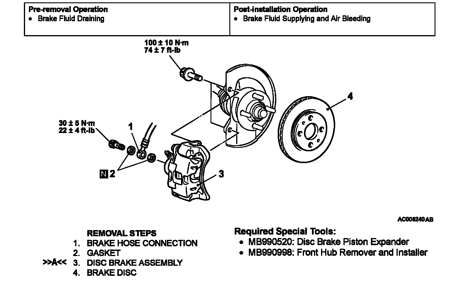 1. In order to measure the brake drag torque, measure the hub torque with the pads removed by the following procedure.