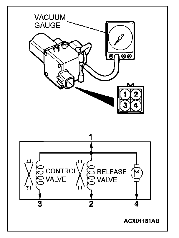 a. Connect the positive battery terminal to auto-cruise vacuum pump connector terminal 1, and the negative battery terminal to terminals 2, 3, and 4. Then the vacuum gauge should read 27 kPa (8.0 in Hg) or more.
