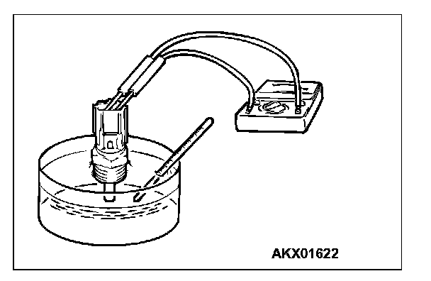 2. With the temperature sensing portion of engine coolant temperature sensor immersed in hot water, check the resistance.