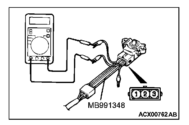 1. Disconnect the fuel tank differential pressure sensor connector and connect special tool MB991348 between the terminals of the disconnected connector.