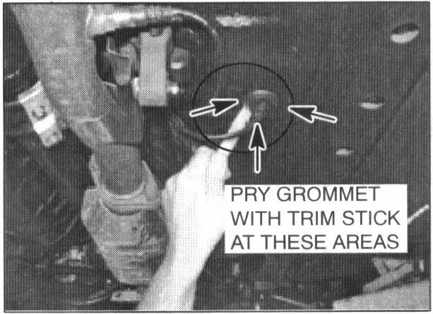 b. Use a trim stick to remove the grommet. Pry the trim stick in the areas indicated to disengage the claws.