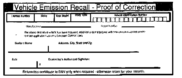 7. FOR VEHICLES REGISTERED IN CALIFORNIA ONLY - Complete and provide to the vehicle owner a VEHICLE EMISSION RECALL - PROOF OF CORRECTIONS FORM (p/n MSSF-106D-00), available from Standard Register at 1-877-227-6115).