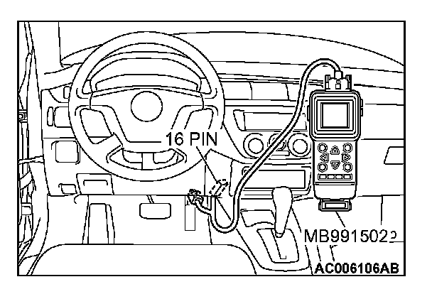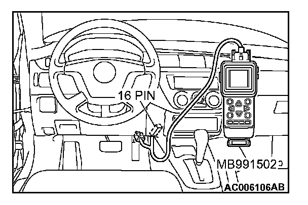 CAUTION: To prevent damage to scan tool MB991502, always turn the ignition switch to the "LOCK" (OFF) position before connecting or disconnecting scan tool MB991502.