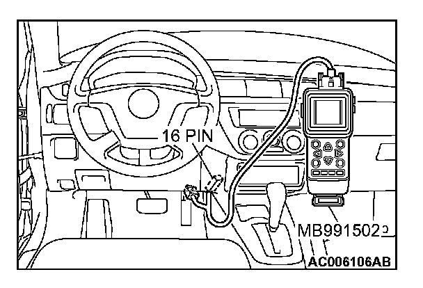 CAUTION: To prevent damage to scan tool MB991502, always turn the ignition switch to the "LOCK" (OFF) position before connecting or disconnecting scan tool MB991502.