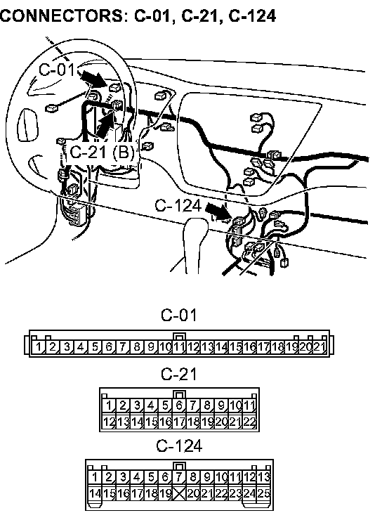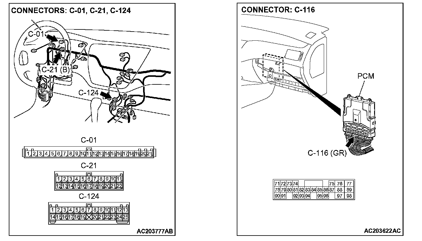 STEP 5. Check joint connector C-21, combination meter connector C-01, intermediate connector C-124 and PCM connector C-116 for loose, corroded or damaged terminals, or terminals pushed back in the connector.
