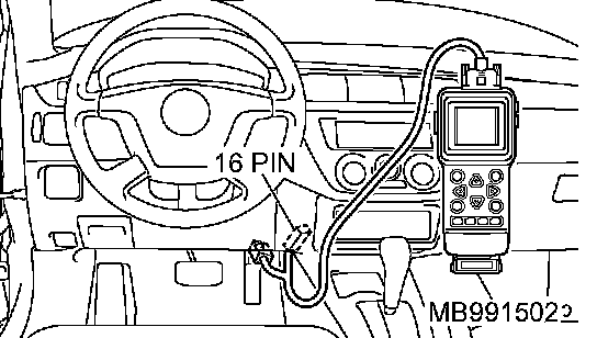 CAUTION: To prevent damage to scan tool MB991502, always turn the ignition switch to the "LOCK" (OFF) position before connecting or disconnecting scan tool MB991502.