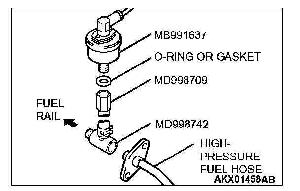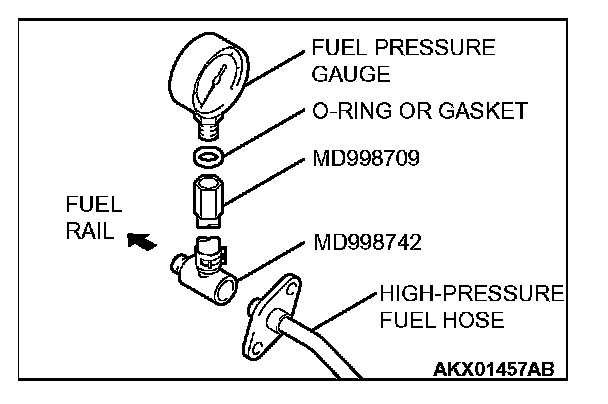2. Place a suitable 0-ring or gasket on assembled special tools MD998709 and MD998742 and install the fuel pressure gauge.