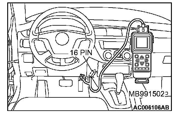 CAUTION: To prevent damage to scan tool MB991502, always turn the ignition switch to the "LOCK" (OFF) position before connecting or disconnecting scan tool MB991502.