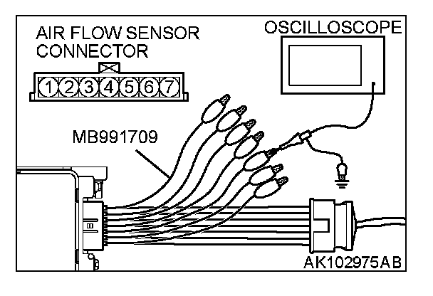 1. Disconnect the volume air flow sensor connector, and connect the test harness special tool (MB991709) in between. (All terminals should be connected.)