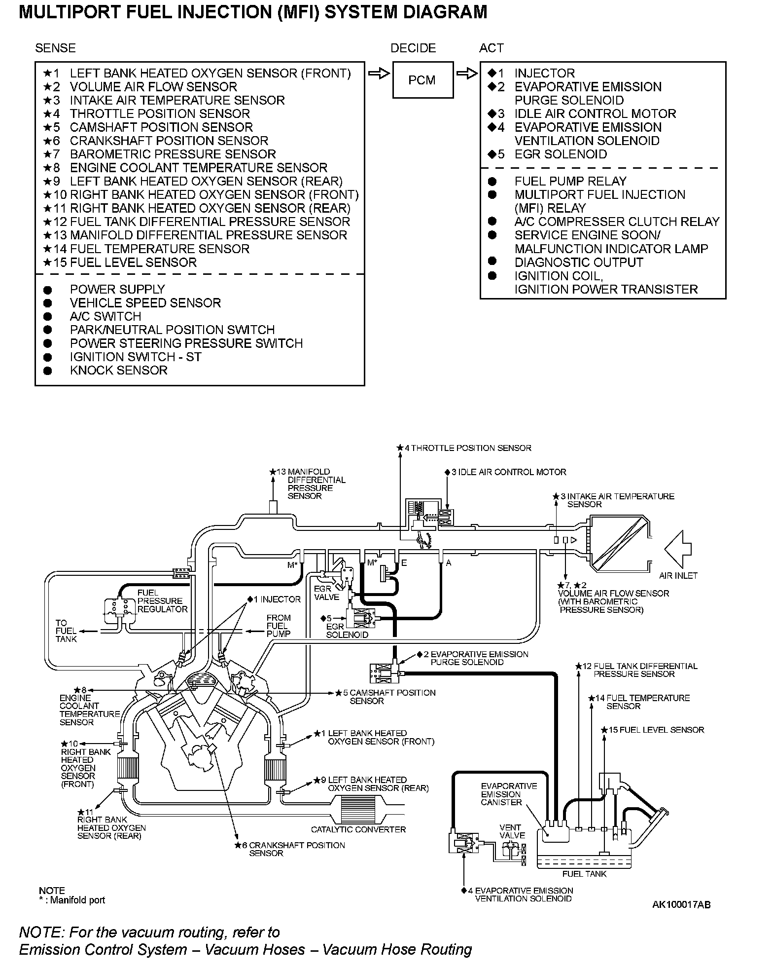 The Multiport Fuel Injection System consists of sensors which detect the engine conditions, the POWERTRAIN CONTROL MODULE (PCM) which controls the system based on signals from these sensors, and actuators which operate under the control of the PCM.
