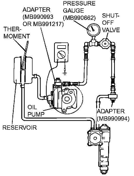 1. Disconnect the pressure hose from the oil pump, and then connect special tools MB990662, MB990993 or MB991217 and MB990994.