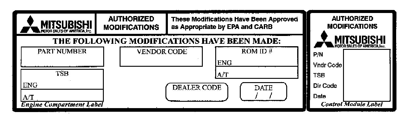 10. Using a ball-point pen, enter the appropriate PCM part number, vendor number, ROM ID #, this TSB number (TSB-04-13-002REV), your dealer code, and the current date on the Engine Compartment / Control Module Label (part no. MSSF-024G-00).