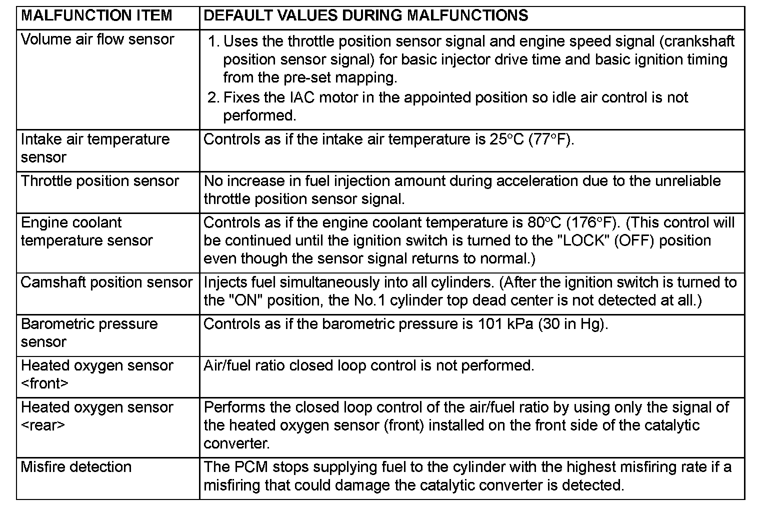 When the main sensor malfunctions are detected by the diagnostic test mode, the vehicle is controlled by means of the given defaults.