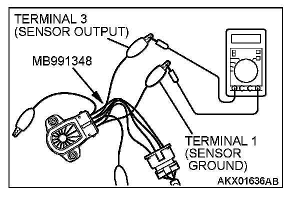 2. Connect a digital voltmeter between throttle position sensor terminals No.3 (sensor output) and No. 1 (sensor ground).