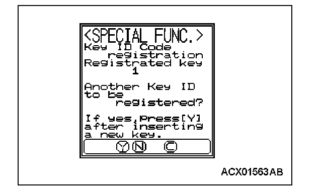 10. The number of keys currently registered will be displayed. To register an additional key, replace the ignition key with the next key to be registered within five seconds and then press the "YES" key. Key ID registration screen will be displayed, then register another key. If key ID registration is complete, press the "NO" key.